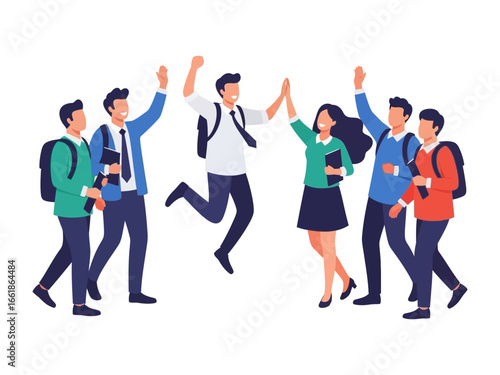 College Student High-Five Scene: Illustrative flat design depicts college students in vibrant motion, capturing the excitement and camaraderie of academics.