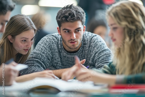 College students in a study group, working together on an assignment and discussing course materials, building academic connections