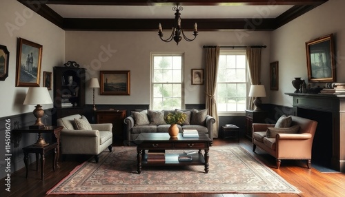 Colonial cottage living room with dark wooden skirting boards, classic furniture, and vintage art pieces for an elegant and timeless look