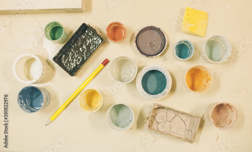 workshop, workplace, working, work, supply, studio, project, crayons, pastel, paint, messy, indoor, hobby, hand-made, enjoy, earth, cup, craft, colours, ceramic, at work, art
