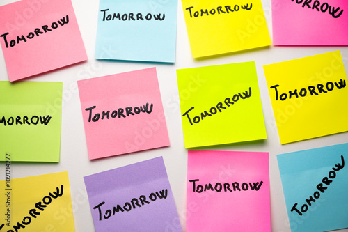 Colored cards, on which the word Tomorrow is written. Habit of procrastinating and postponing.