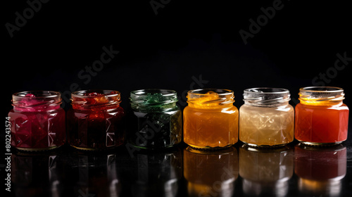 Colored jars of different jams with fresh berries and fruits stand in a row, black background. AI generated.