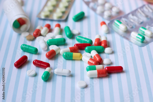 Colored tablets and capsules are scattered on the table.