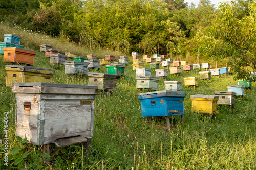 colored wooden beehives in golden hour - honey bees flying around wooden beehives.colorful beehives on the hill in Prahova Romania