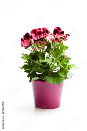 Colorful Pelargonium flower in flowerpot isolated on white