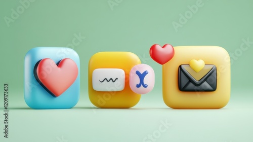 Colorful 3D Icons of Heart, Message, and Email on a Soft Green Background