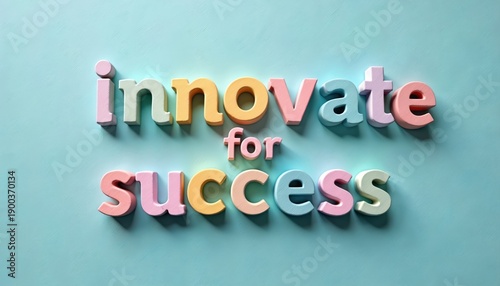 Colorful 3D letters spell innovate for success. Bright pastel alphabet shapes arranged on blue background. Modern concept for business growth and achievements.