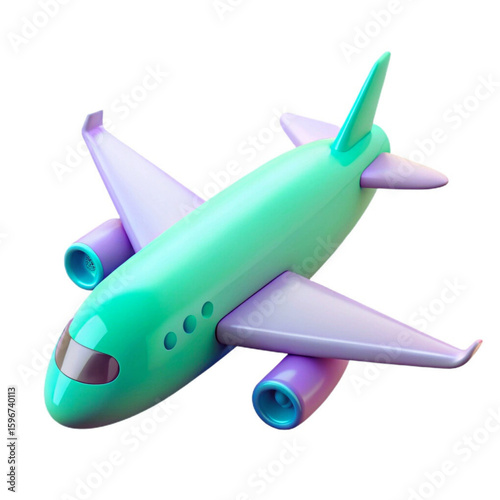 aeroplane, aeroplane, aircraft, aviation, travel, transportation, flight, flying, jet, airliner, three-dimensional, model, render, digital, art, illustration, cartoon, stylised, toy, whimsical, colourful, vibrant, teal, green, purple, lavandula, wing, engine, fuselage, cockpit, window, isolated, white, background, studio, shot, concept, design, modern, futuristic, vacation, holiday, journey, adventure, tour tourism, air, commercial, passenger
