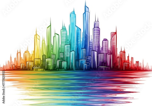 city landscape, city, skyline, building, skyscraper, abstract, colourful, rainbow, water, art, illustration, modern, urban, architecture, design, vibrant, bright, blue, green, yellow, red, purple, white background, graphic