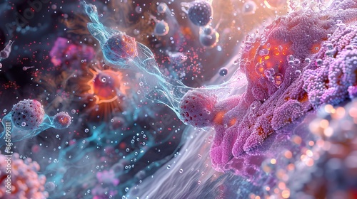 Colorful abstract depiction of microscopic cells in a vibrant and dynamic environment, showcasing intricate biological structures.
