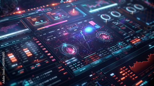 Colorful abstract illustration of a digital dashboard with charts, graphs, and data. High-tech interface with analytics and metrics. Futuristic design reflecting modern technology