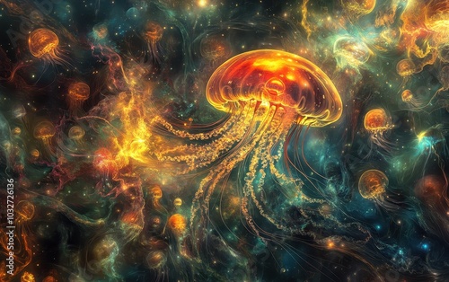 Colorful Abstract Jellyfish Floating in Cosmic Space