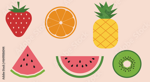 fruit, strawberry, orange, pineapple, watermelon, kiwi, fresh, healthy, sweet, juicy, summer, tropical, cartoon, vector, illustration, design, graphic, food, diet, nature, vibrant, background, organic, vegetarian, ingredient, vitamin, delicious, natural, drawing, element, icon, simple, cut-out, nourishment, wellness, fruity, produce, pattern, clip