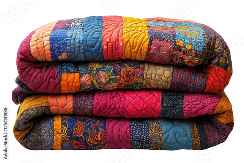 Colorful and textured quilts stacked neatly, showcasing intricate designs and warm hues, perfect for adding coziness to any living space.