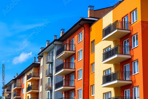 building, architecture, housing, colourful, modern, exterior, facades, balcony, window, sky, blue, sunny, city, urban, residential, home, multistorey, row, house, orange, yellow, red, bright, design, structure, construction, contemporary, property, real estate, development, living, community, colours, view, perspective