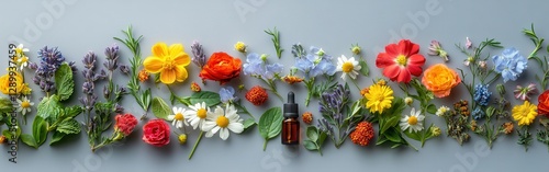Colorful Arrangement of Fresh Flowers and Natural Ingredients for Beauty and Wellness Products on a Gray Background
