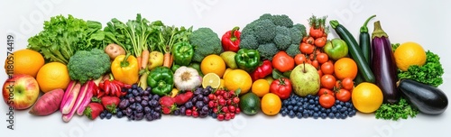 Colorful Arrangement of Fresh Fruits and Vegetables Showcasing a Variety of Textures, Shapes, and Vibrant Colors on a White Background
