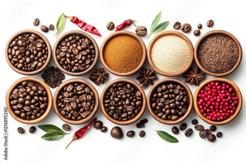 Colorful arrangement of various spices and coffee beans in ceramic bowls on a bright surface