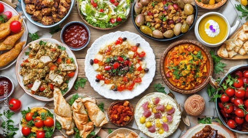 Colorful Array of Delicious Dishes on Wooden Table Spread