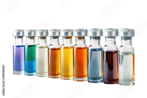 Colorful array of glass vials filled with various liquids displayed on a clean white surface in a well-lit environment isolated on transparent background