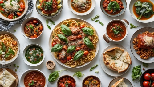 Colorful array of italian dishes on white background