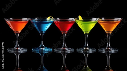 Colorful Assorted Cocktails in Elegant Glasses on Black Background Reflecting Light