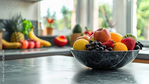 Colorful assorted fruits in bowl on marble countertop with sunny kitchen background