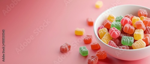 Colorful Assorted Gummies in White Bowl on Pink Background