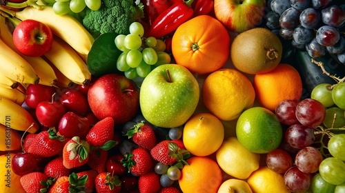 Colorful assortment of fresh fruits and vegetables closeup image. Bananas, apples, oranges. Grapes, strawberries, cherries close up photo. Freshness, abundance of healthy food concept