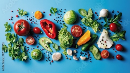 Colorful assortment of fresh vegetables and spices set against a vibrant blue backdrop Emphasizing healthy eating and culinary creativity