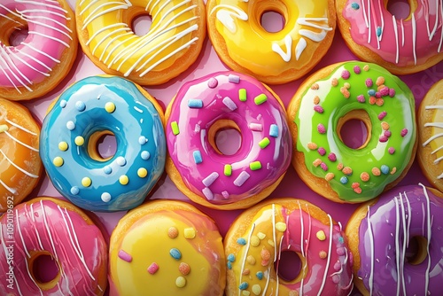 Colorful Assortment of Glazed Donuts with Sprinkles and Icing on a Pink Background, Perfect for Sweet Treats and Dessert Themes