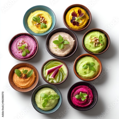 Colorful Assortment of Gourmet Dips in Small Bowls for Appetizers or Parties