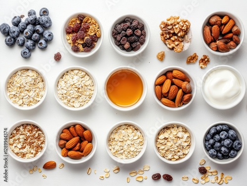 Colorful assortment of healthy snacks with nuts, oats, berries, honey, and yogurt arranged neatly on a bright white background for nutrition-focused imagery