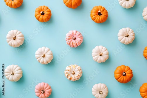 Colorful Assortment of Mini Pumpkins on Blue Background for Autumn Decor