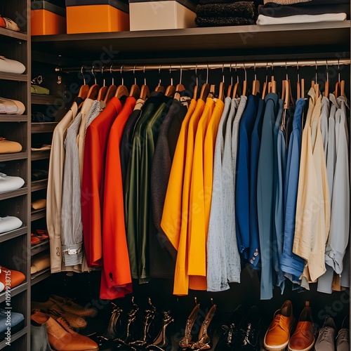 clothing, apparel, fashion, clothes rack, closet, shelf, hanger, display, retail, style, outfit, garment, textile, fabric, colours, organisation, storage, interior, design, decor, background, wall, rack, accessory, shoe, boot, collection, assortment, variety, selection, diverse, coordinated, ensemble, arrangement, inventory, merchandise, presentation, exhibit, showcase