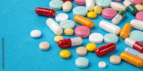 Colorful assortment of pharmaceutical pills and capsules on a vibrant blue background, medicine