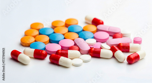 Colorful assortment of prescription medication pills for healthcare treatment and pharmaceutical industry use