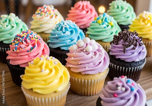 cupcake, dessert, sweet, treat, frosting, icing, sprinkle, colourful, vibrant, pastel, pink, blue, yellow, green, purple, baked goods, confectionery, party, celebration, birthday, festive, delicious, indulgence, sugary, food photography, closeup, arrangement, variety, swirl, creamy