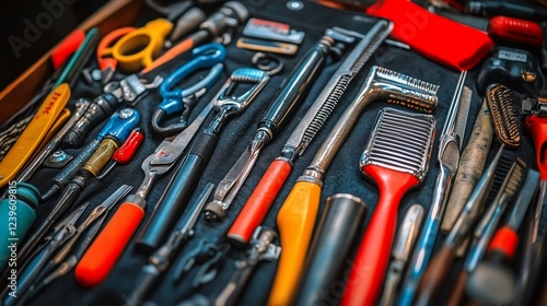 tool, collection, workshop, equipment, metal, plastic, red, orange, blue, black, grey, variety, organised, arrangement, drawer, workstation, instrument, hardware, maintenance, repair, craft, bricolage, precision, accessory, set, kit, many, assortment, selection, various, different, colourful, bright, dark, background, texture