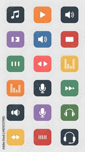 audio, video, icon, multimedia, music, sound, playback, recording, editing, streaming, media, control, interface, user, life events, digital, technology, colourful, vibrant, modern, design, graphic, illustration, symbol, signs, buttons, player, speaker, earphones, microphone, soundboard, mixing, console, waveform, play, pause, stop, rewind, fast, forward, volume, mute, element, app, web, software, development, creative, asset