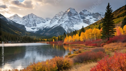 Colorful Autumn Landscape with Snow-Capped Mountains and Lake – Scenic Fall Foliage in Nature