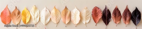 Colorful Autumn Leaves of Various Shades Arranged in a Gradient Pattern on Beige Background, Symbolizing Seasonal Transition and Change