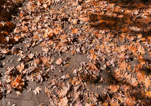 Colorful autumn leaves on pavement, fall season background with natural foliage and street texture