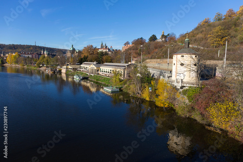 Colorful autumn Prague gothic Castle with the Lesser Town above River Vltava in the sunny Day, Czech Republic