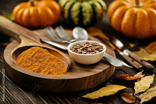 spice, seed, pumpkin, autumn, wooden, table, cooking, turmeric, fall, decoration, warm, colours, natural, harvest, cosy, food, organic, leaf, culinary, display, spoon, rustic, gathering, setting, healthy, seasonal, favor, kitchen, nature, texture, enjoyment, warmth