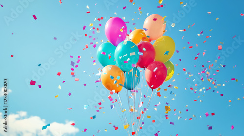 Colorful balloons and confetti floating in clear blue sky