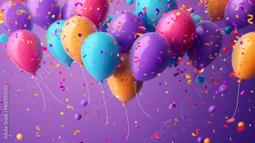 Colorful balloons and confetti on a vibrant purple background. Perfect for birthday, celebration, anniversary, party, and festive event designs.