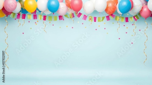 Colorful balloons arranged on sides and top with empty field banner for customizable content on light background, balloons, fun