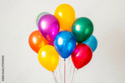 Colorful balloons in red, blue, yellow, and pink against a white background