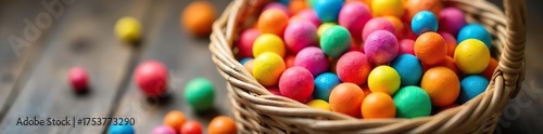 Colorful Balls Overflowing Woven Basket Playful Close-Up for Childhood, Crafts, Home Decor